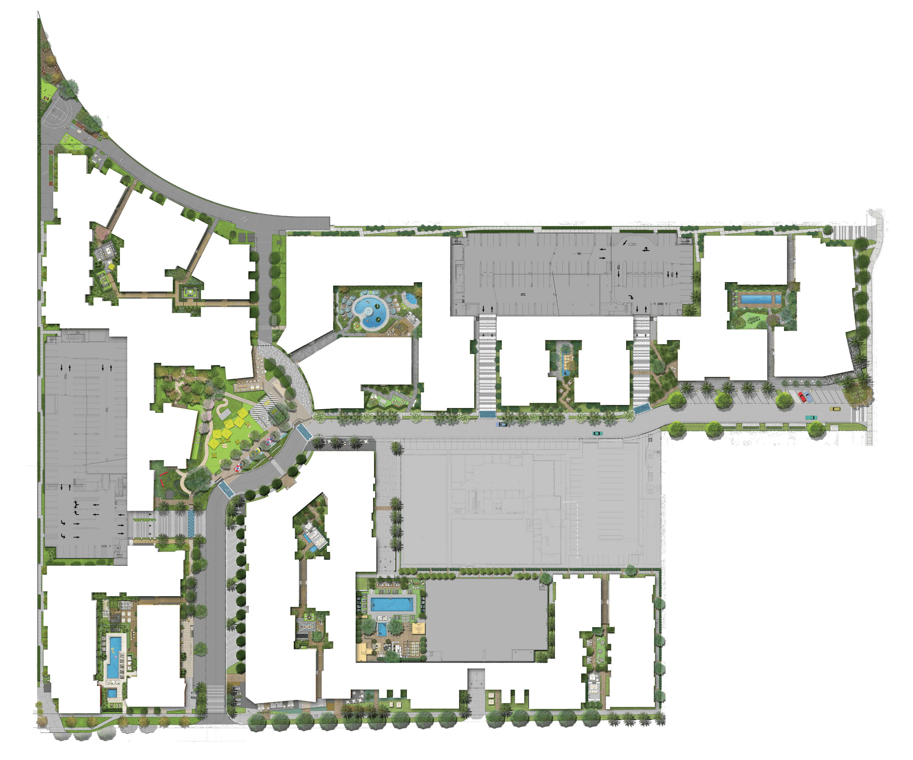 Each building features its own mix of indoor and outdoor amenities, alongside a central park and plaza.